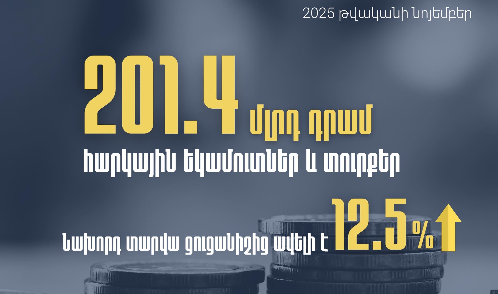 «2025 թվականի նոյեմբերին հարկ վճարողների հետ ապահովել ենք 201.4 մլրդ դրամ հարկեր և տուրքեր, ինչը նախորդ տարվա նույն ամսվա համեմատ ավելի է 22.3 մլրդ դրամով կամ 12.5 %֊ով։