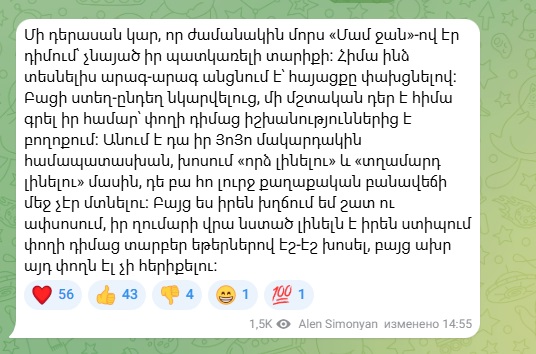 Լևոն Հարությունյանի հարցազրույցը կպել է ԱԺ նախագահ Ալեն Սիմոնյանի «հոգու քնքուշ լարերին» և, վերջինս որոշել է «դոշ տալ» իր ու իր քաղաքական կնքահոր համար՝ Նիկոլից ավելի Նիկոլ երևալով: