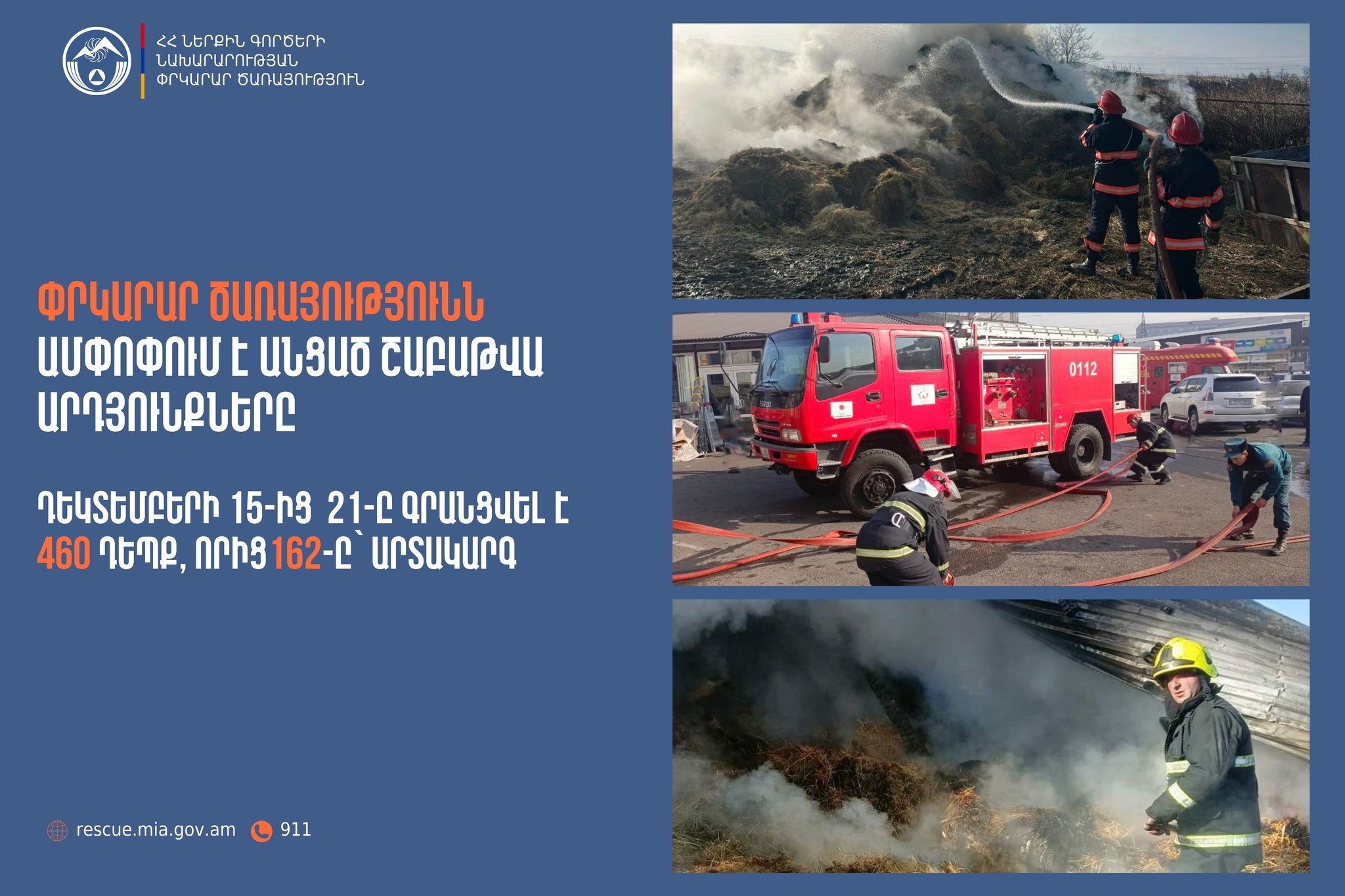 Դեկտեմբերի 15-21-ը ՆԳՆ ՓԾ ճգնաժամային կառավարման ազգային կենտրոնում գրանցվել է 460 դեպք, որից 162-ը՝ արտակարգ: