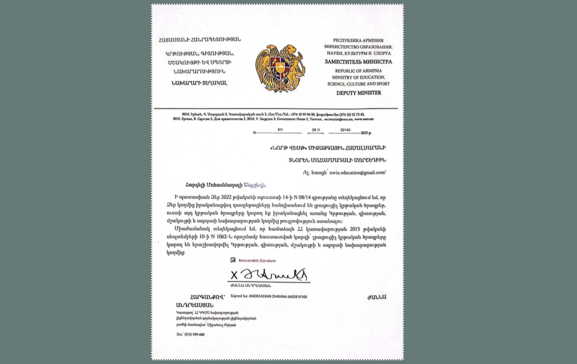 Նախարարությունից նրան տեղեկացրել են, որ իր առաջարկած ծրագրերը կարճաժամկետ լրացուցիչ դասընթացներ են, որոնց համար լիցենզիա հարկավոր չէ ու առաջարկել են դիմել նախարարություն՝ այդ ծրագրերի երաշխավորման համար։