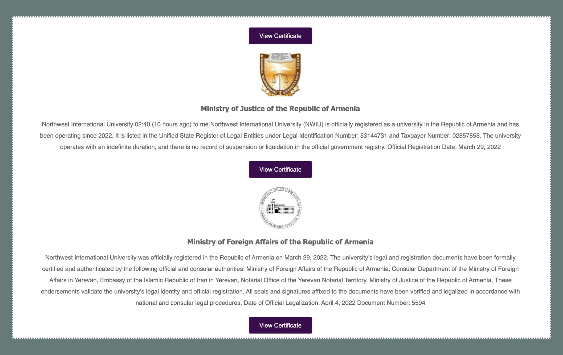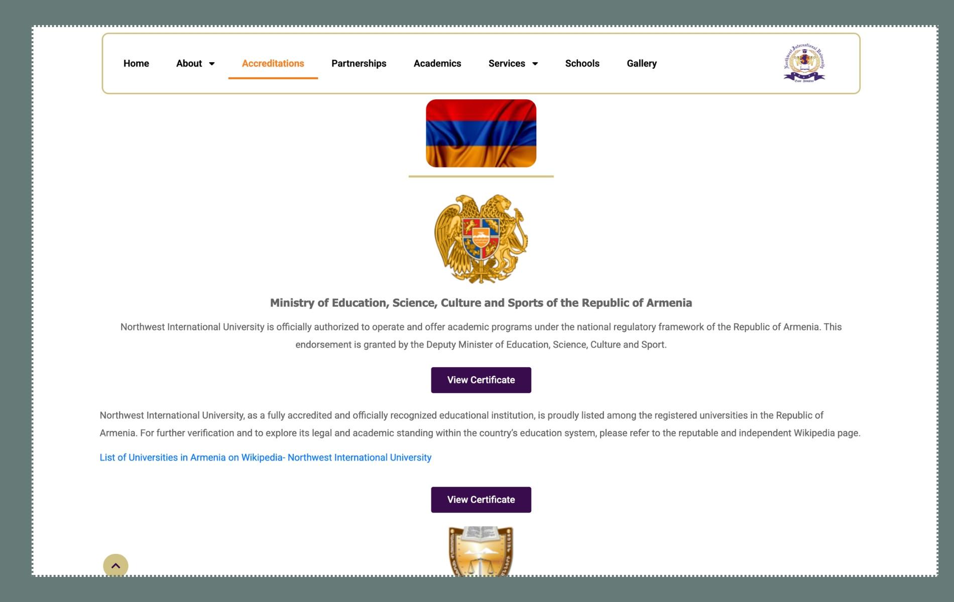 North West International University-ն (Հյուսիսարևմտյան միջազգային համալսարան, NWIU) ունի կայք, որի «հավատարմագրումներ» բաժնում Հայաստանի հետ համագործակցության վերաբերյալ առանձին բաժին կա։
