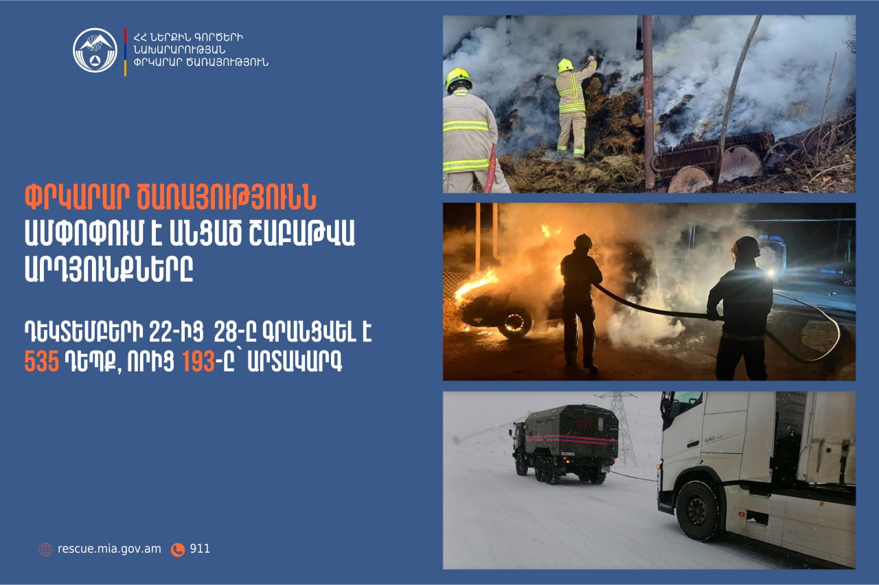Դեկտեմբերի 22-28-ը ՆԳՆ ՓԾ ճգնաժամային կառավարման ազգային կենտրոնում գրանցվել է 535 դեպք, որից 193-ը՝ արտակարգ: Այս մասին տեղեկացնում են ՆԳՆ Փրկարար ծառայությունից: