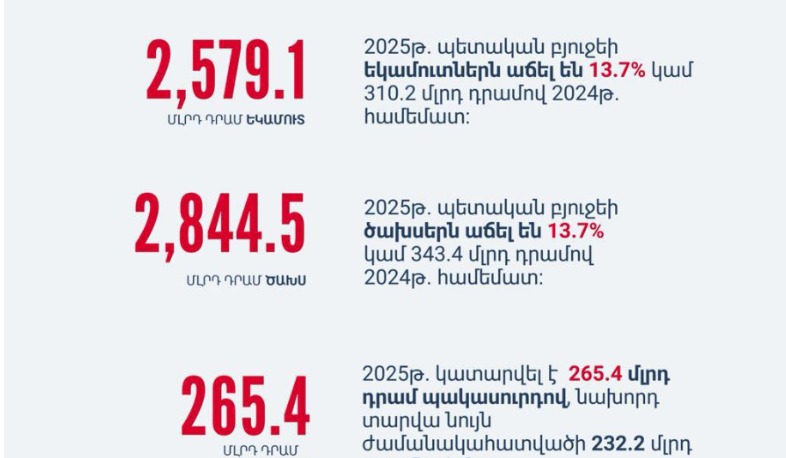 2025 թվականի հունվար-նոյեմբեր ամիսների ընթացքում ՀՀ պետական բյուջեն կատարվել է 265.4 մլրդ դրամ պակասուրդով՝ նախորդ տարվա նույն ժամանակահատվածի 232.2 մլրդ դրամի դիմաց: