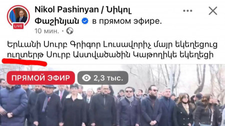 Նիկոլ Փաշինյանի ու նրա կողակցի առաջնորդությամբ ՔՊ-ական նախարարները, պատգամավորներն ու այլ պաշտոնյաներ Սուրեբ Գրիգոր Լուսավորիչ եկեղեցում պատարագին ներկա լինելուց հետո քայլում են դեպի Սուրբ Աննա Կաթողիկե եկեղեցի։ ՔՊ-ականների երթն ուղիղ եթերով ցուցադրվում է նաև Նիկոլ Փաշինյանի ֆեյսբուքյան էջով։