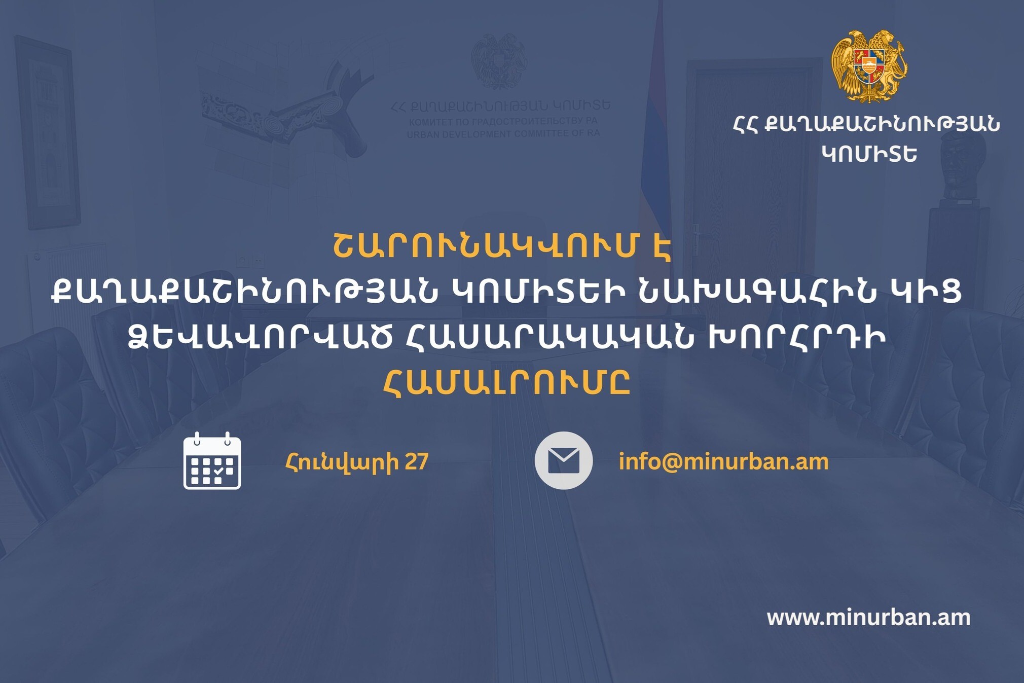 Ձևավորվել է քաղաքաշինության կոմիտեի նախագահին կից հասարակական խորհուրդ January 9, 2026 by Media Ձևավորվել է քաղաքաշինության կոմիտեի նախագահին կից հասարակական խորհուրդ, որի կազմը հաստատվել է Քաղաքաշինության կոմիտեի նախագահի 2025 թվականի դեկտեմբերի 18-ի 224-Ա…