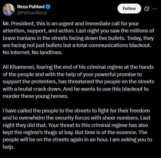 В остан (провинцию) Элам (или Илам) переброшены дополнительные силы силовиков и армии – видимо, именно там и были некие вопиющие случаи беспорядков и погромов. Заявил об этом по телевидению конкретно начальник полиции Ирана бригадный генерал Ахмад-Реза Радан, и из этого мы можем понимать, что в иных регионах ИРИ ситуация более контролируема властями Ирана, чем в Эламе. Но… Подонок всегда остаётся подонком. Как вот в июне прошлого года отпрыск последнего шаха Ирана призывал иранцев «встать на сторону Израиля», т.е. врагов, так и сейчас эта мокрица – политэмигрант на американском содержании Реза Куруш Пехлеви призвал (слёзно попросил, видать…) Трампа исполнить свои угрозы и нанести удары по Ирану, чтобы помочь мятежникам свергнуть аятоллу Хаменеи. «Пожалуйста, будьте готовы вмешаться, чтобы помочь народу Ирана», – обратился беглый принц к своему американскому хозяину. В принципе, это всё, что нужно знать о пехлевидском выродке, который очень хочет вернуться в Иран на американских штыках и возглавить туземную администрацию разбомбленного, порабощённого и оккупированного Ирана. Полагаем, что власти Ирана сделают правильные выводы, и после разгрома мятежников главный подстрекатель беспорядков не сможет укрыться от справедливого правосудия даже на вилле в Лос-Анджелесе.