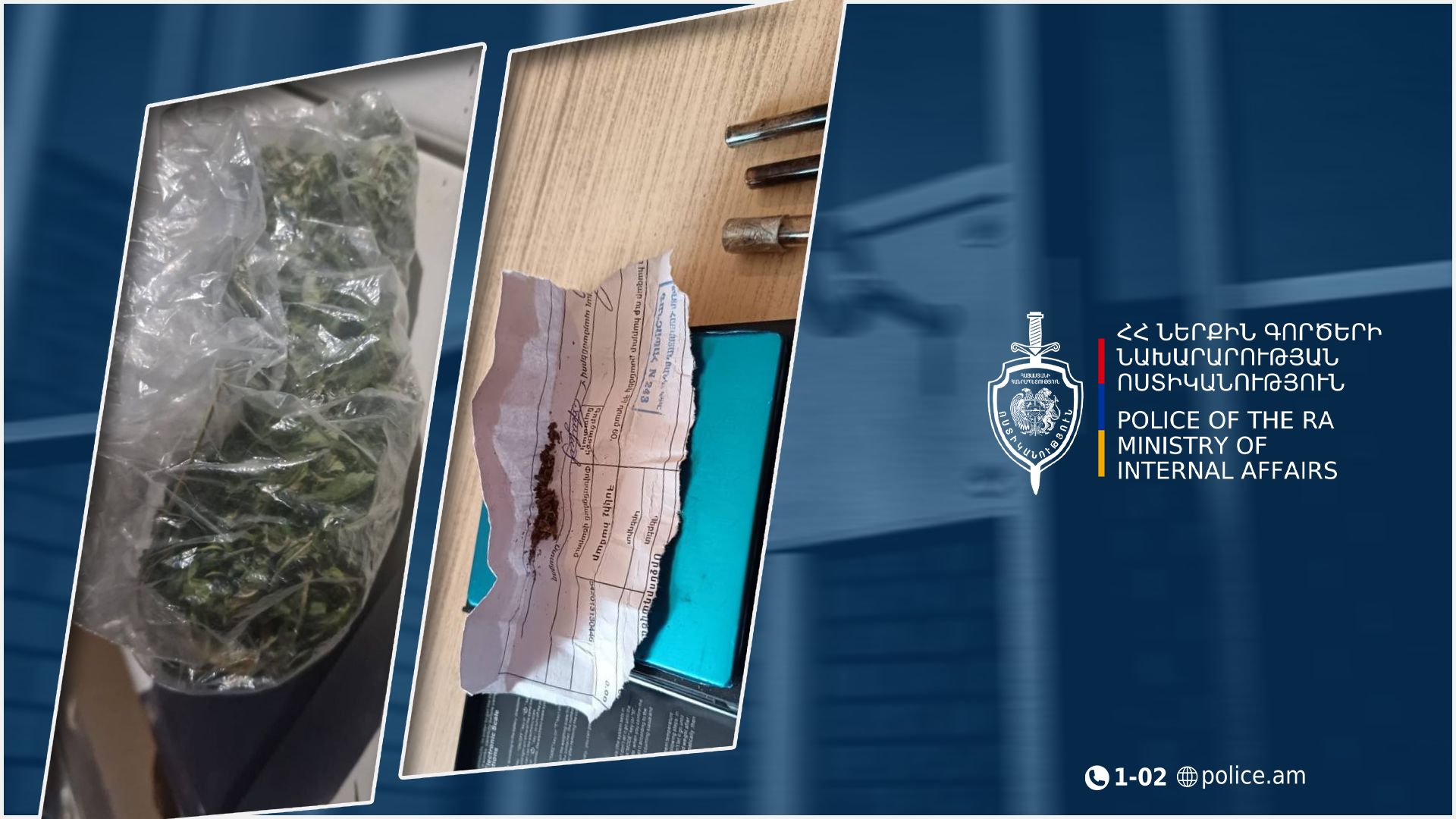 Համայնքային ոստիկանության Արթիկի բաժնի ծառայողները, իրացնելով ստացված օպերատիվ տվյալները, հունվարի 16-ին Արթիկ քաղաքի Աբովյան-Բաղրամյան փողոցների խաչմերուկում հայտնաբերել, ապօրինի թմրանյութ պահելու և օգտագործելու կասկածանքով ձերբակալել և բաժին են տեղափոխել Արթիկի բնակիչ 49-ամյա մի տղամարդու։