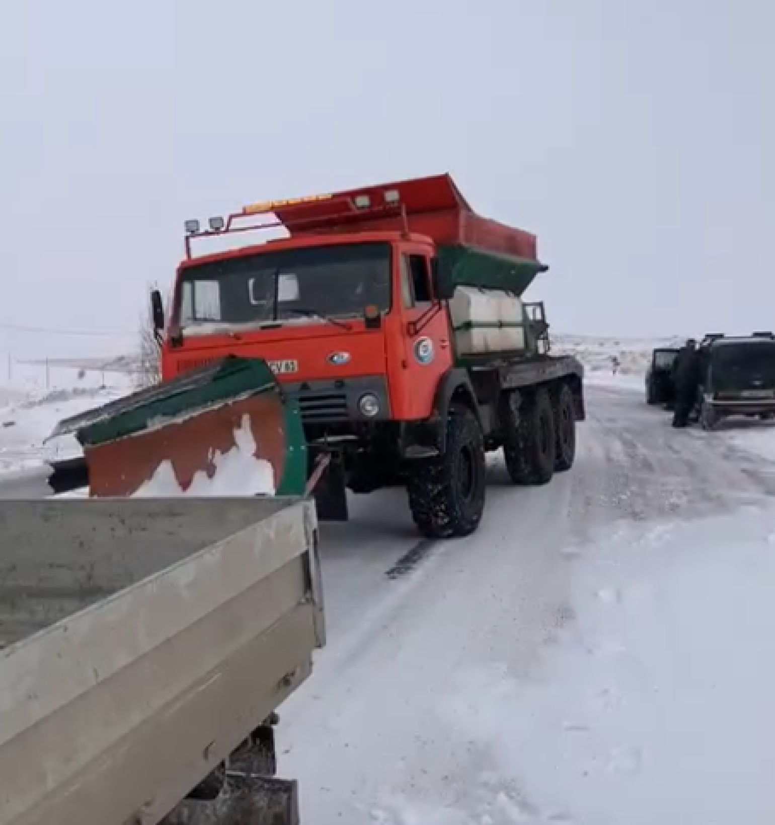Ճանապարհը սպասարկող կազմակերպության աշխատակիցները տեխնիկայի միջոցով հանում են ձյան մեջ արգելափակված մեքենաներ։