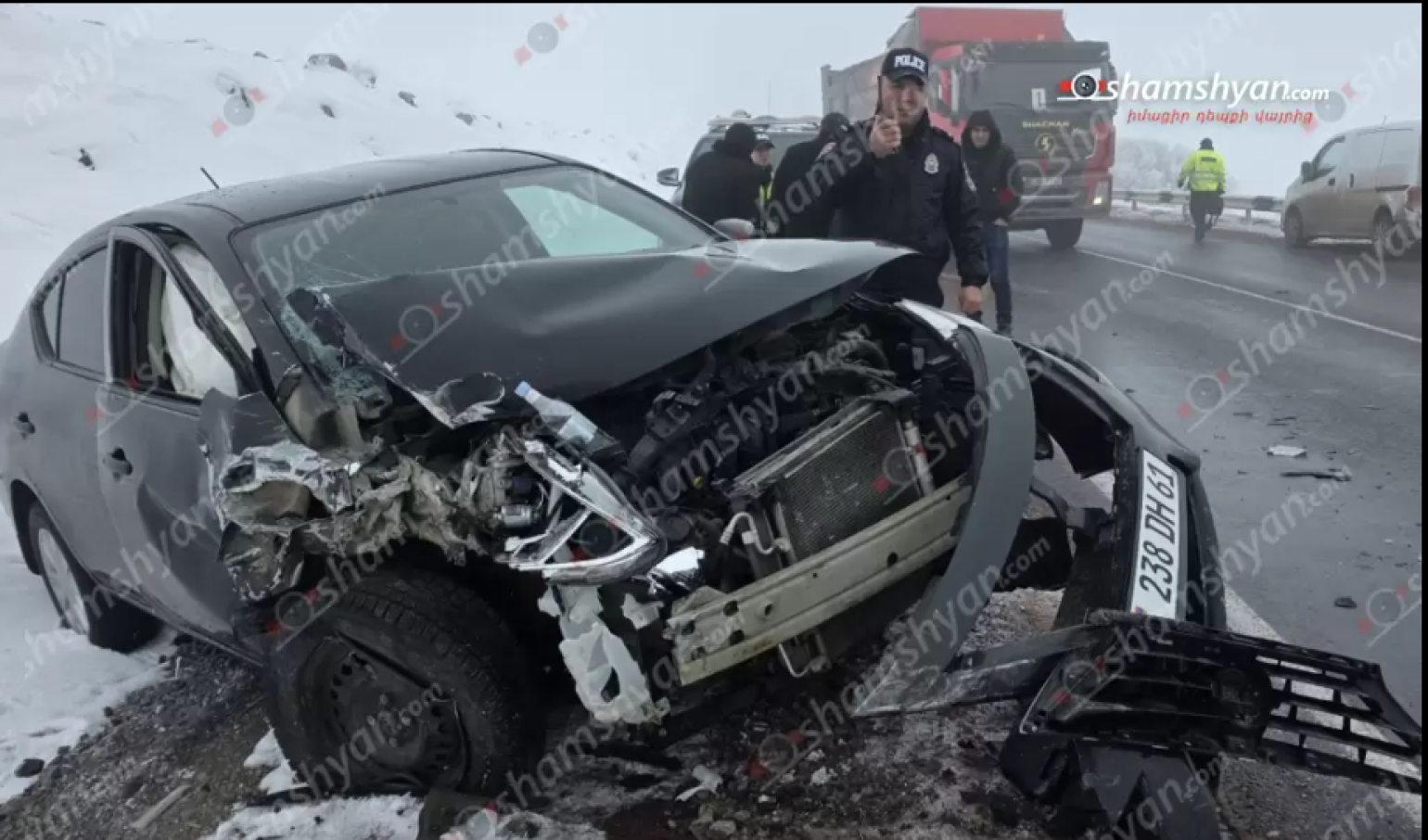 Ֆոտոլրագրողը հայտնում է, որ նշված ճանապարհահատվածի մոտ 10 կմ հատված ամբողջությամբ մերկասառույց է, իսկ ճանապարհն սպասարկող ճանշինը ոչինչ չի արել ճանապարհը աղ ու ավազի խառնուրդով մշակելու համար ու այդ հատվածում 4 ժամվա ընթացքում 5 ճանապարհատրանսպորտային պատահարներ են տեղի ունեցել, որոնք կներկայացնենք։