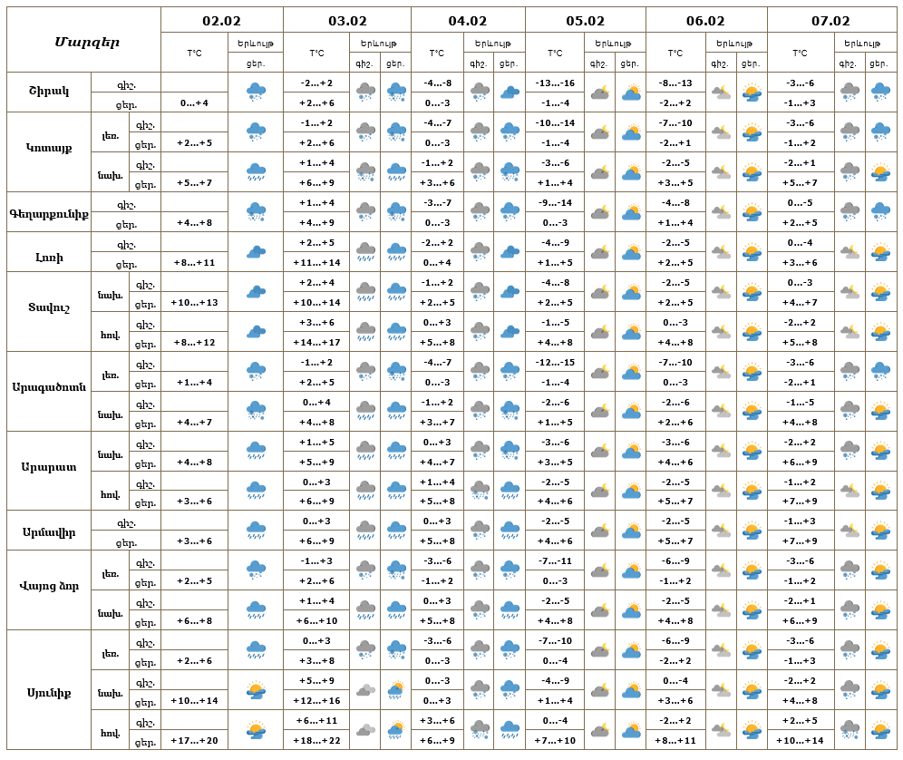 Հանրապետության տարածքում փետրվարի 2-ի ցերեկը, 3-4-ը, 7-ին առանձին շրջաններում սպասվում են տեղումներ, նախալեռնային և հովտային շրջաններում՝ ձնախառն անձրևի և անձրևի, լեռնային շրջաններում՝ ձյան տեսքով, լեռնային առանձին շրջաններում՝ բուք, ցածր հորիզոնական տեսանելիություն։ Փետրվարի 5-6-ը սպասվում է առանց տեղումների եղանակ։