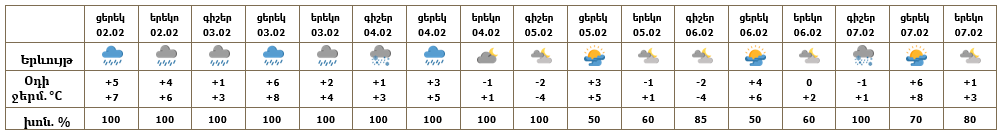 Երևան քաղաքում փետրվարի 2-ի ցերեկը, 3-4-ը, 7-ի գիշերը և առավոտյան ժամերին սպասվում են տեղումներ՝ անձրևի և ձնախառն անձրևի տեսքով։ Փետրվարի 5-6-ը, 7-ի ցերեկը սպասվում է առանց տեղումների եղանակ։ Փետրվարի 3-ի գիշերը և առավոտյան սպասվում է մառախուղ։