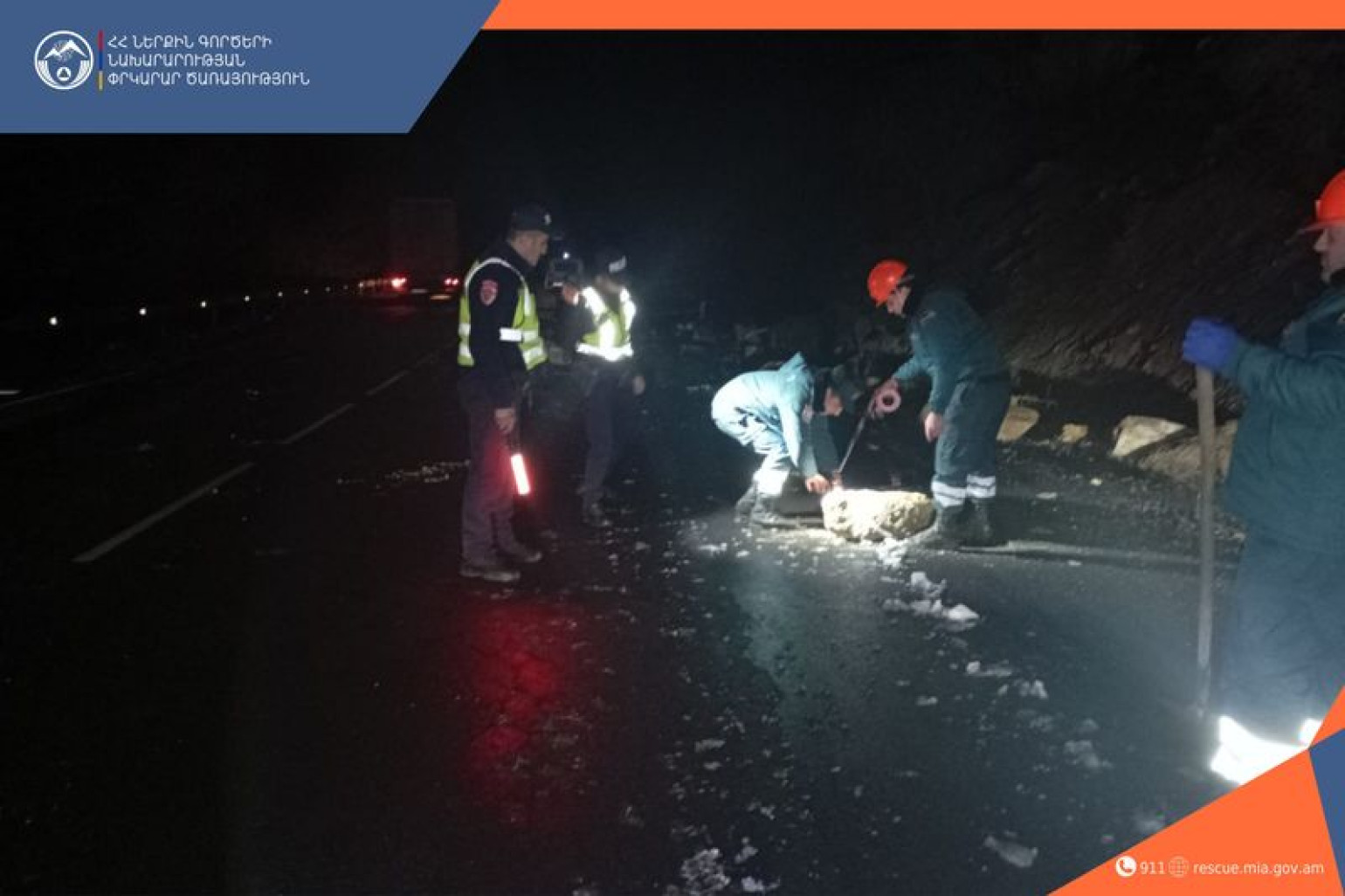 Փրկարարները սահմանազատել են տարածքը և հատուկ տեխնիկայի օգնությամբ թափված քարերը հեռացրել ավտոճանապարհից․ երթևեկությունը վերականգնվել է։