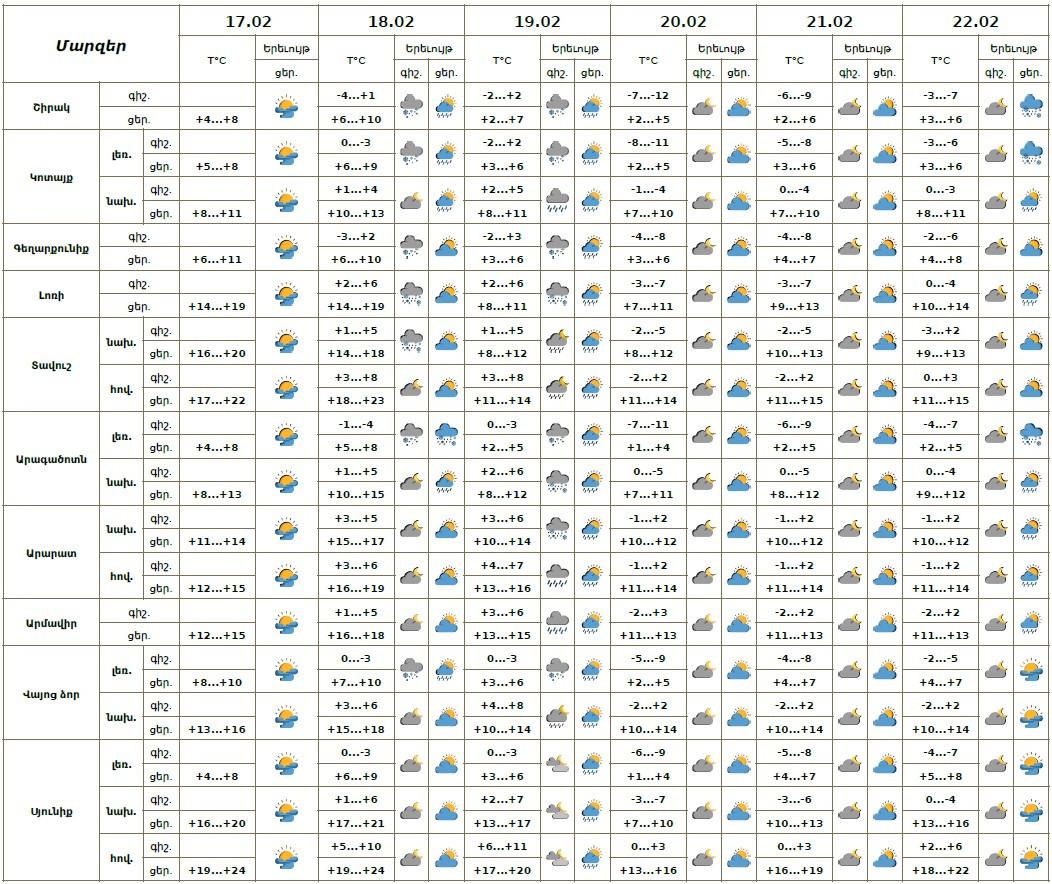 Քամին` հարավարևմտյան`3-6մ/վ, փետրվարի 17-ի ցերեկը, 18-19-ին, 22-ին առանձին շրջաններում սպասվում է նաև քամու ուժգնացում 14-17մ/վ արագությամբ, լեռնային առանձին հատվածներում բուք, ցածր հորիզոնական տեսանելիություն։ Օդի ջերմաստիճանը փետրվար 17-ի ցերեկը, 18-ին կբարձրանա ևս 2-3 աստիճանով, 19-20-ին աստիճանաբար կնվազի 4-5, Լոռիում, Տավուշում և Սյունիքում՝ 6-9 աստիճնաով։
