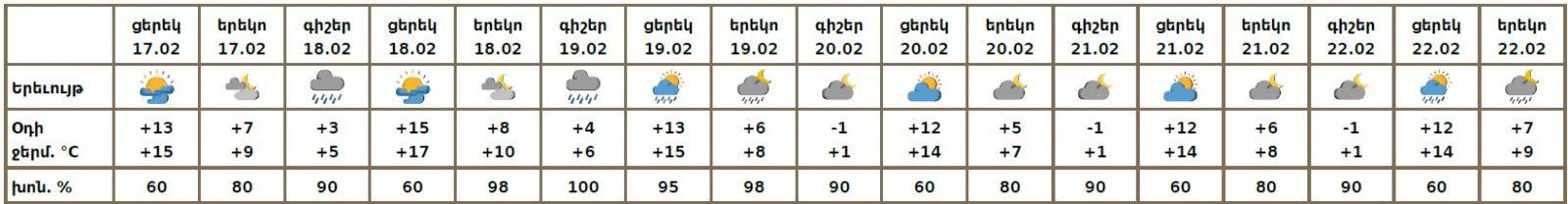 Փետրվարի 17-ի և 18-ի ցերեկը, 20-21-ին, 22-ի գիշերը սպասվում է առանց տեղումների եղանակ։ Փետրվարի 18-ի գիշերը և առավոտյան հնարավոր է, 19-ին և 22-ի ցերեկը սպասվում է անձրև։