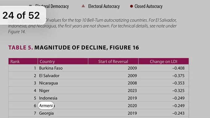 Իսկ հիմա նայեք կցված սլայդին, ըստ որի ժողովրդավարության անկման ուժգնությամբ Հայաստանը 6-րդն է աշխարհում։