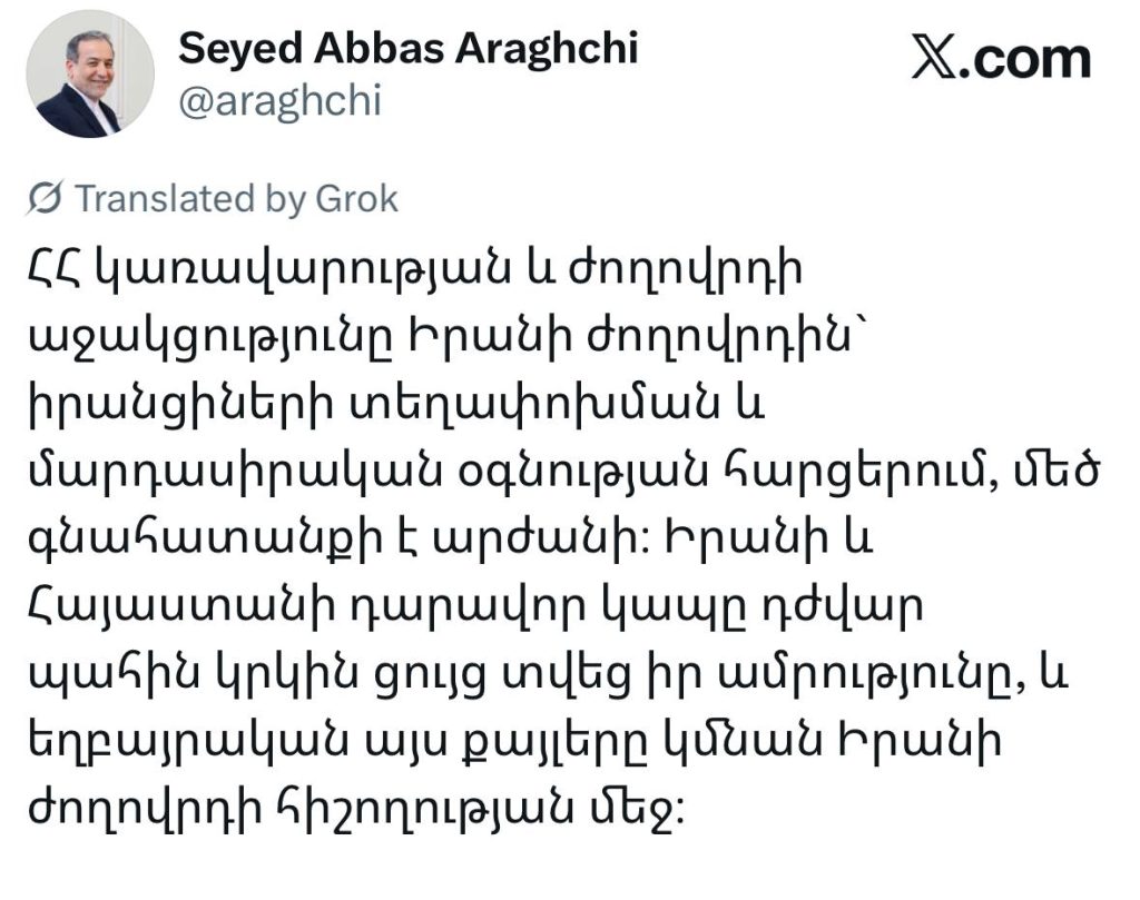 Իրանի արտգործնախարար Աբաս Արաղչին X սոցիալական ցանցում հայերեն գրառում է կատարել՝ շնորհակալություն հայտնելով Հայաստանին ցուցաբերած աջակցության համար։