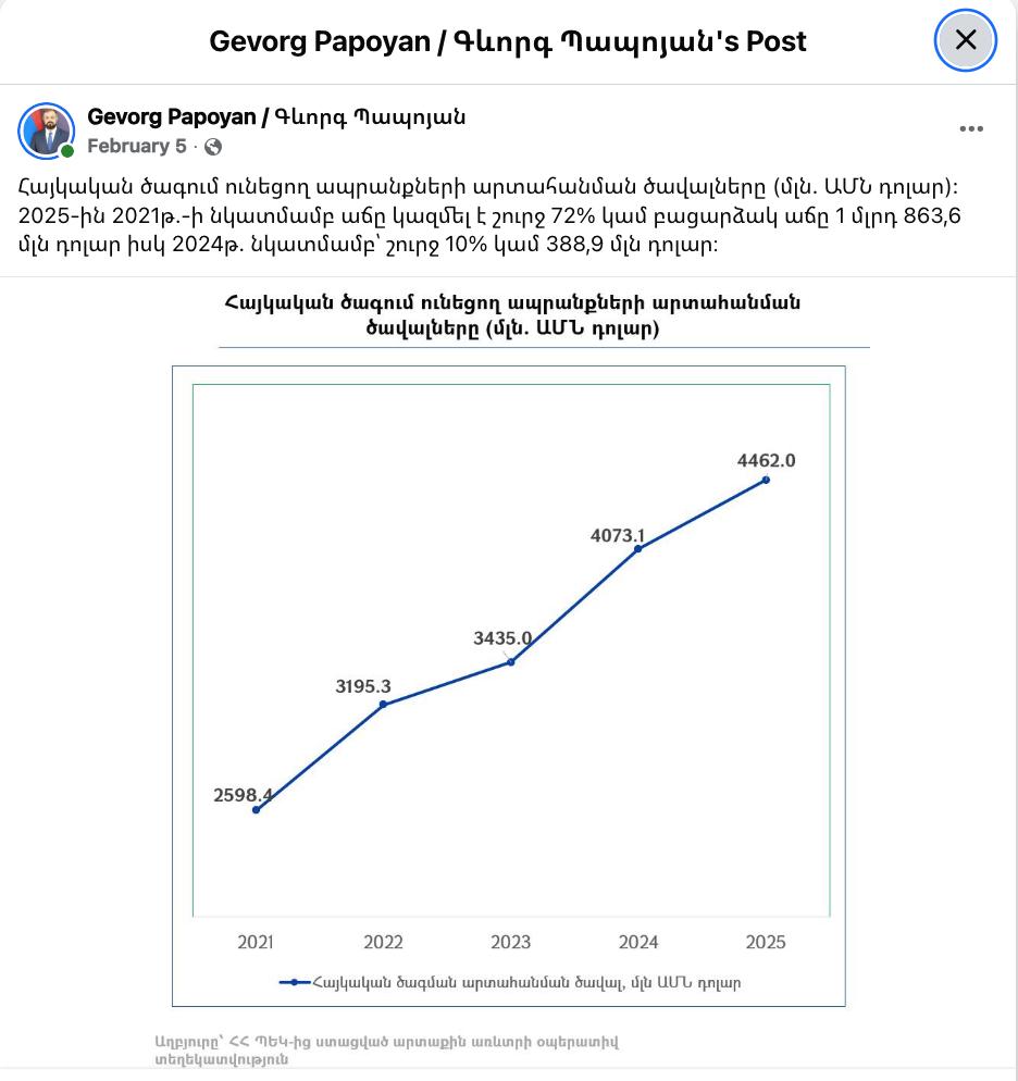 Փետրվարի 5-ին Էկոնոմիկայի նախարար Գևորգ Պապոյանը ֆեյսբուքյան իր էջում գրառմամբ տեղեկացրել է, որ 2025 թվականին Հայաստանից արտահանվել է մոտ 4.5 մլրդ դոլարի հայկական ծագում ունեցող արտադրանք։ 2024 թվականի համեմատ այն աճել է շուրջ 10%-ով, իսկ 2021 թվականի համեմատ՝ 72%-ով։