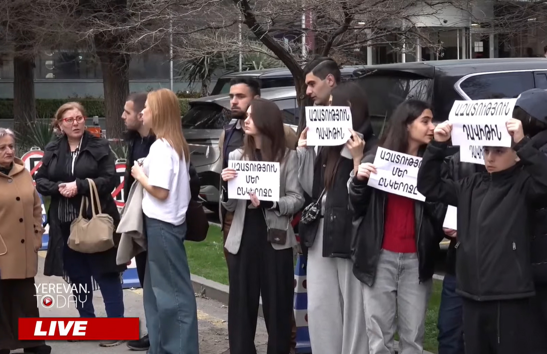 Սուրբ Աննա եկեղեցուց ձերբակալված, այնուհետև կալանքի տարված դպրոցական Դավիթ Մինասյանի դասընկերները և նրանց ծնողներն ակցիա են անում Երևանում ՄԱԿ-ի գրասենյակի մոտ։