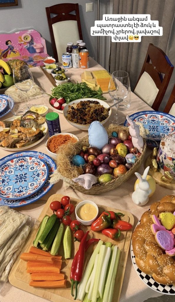Երգիչ Գևորգ Մկրտչյանն ու նրա կինը՝ դերասանուհի Քրիստինա Հովհաննիսյանը, միասին են պատրաստել իրենց Զատկական սեղանը՝ ստեղծելով ընտանեկան ջերմ ու հաճելի մթնոլորտ։