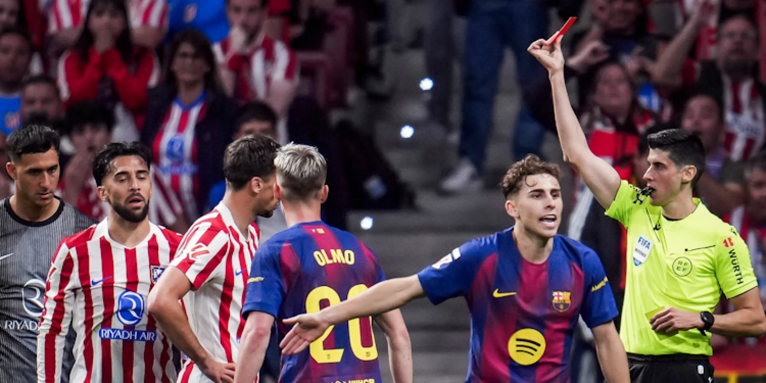 Հաշիվը 39-րդ րոպեին բացեց մադրիդցիների հարձակվող Ջուլիանո Սիմեոնեն։ Սակայն դաշտի տերերի ուրախությունը կարճ տևեց․ ընդամենը երեք րոպե անց Մարկուս Ռեշֆորդը վերականգնեց հավասարությունը: Կրքերը բորբոքվեցին առաջին խաղակեսի ավելացված ժամանակում. 45+7-րդ րոպեին Լամին Յամալի նկատմամբ թույլ տված կոպիտ խախտման համար ուղիղ կարմիր քարտով դաշտից հեռացվեց «Ատլետիկոյի» կիսապաշտպան Նիկոլաս Գոնսալեսը՝ տանտերերին թողնելով 10 հոգով։