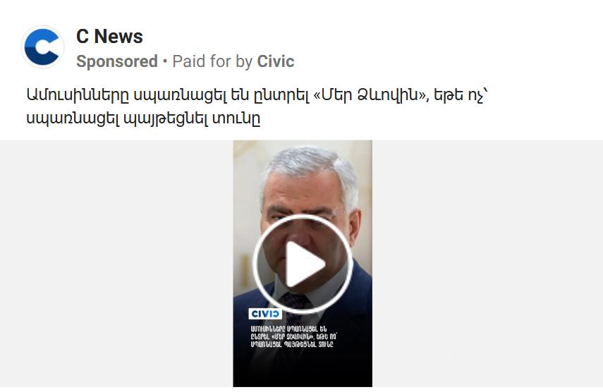 25 գովազդ էլ տարածել է իշխող «Քաղաքացիական պայմանագիր» կուսակցությունը՝ վճարելով 2527 դոլար։ Բացի կուսակցության պաշտոնական էջից, իշխող ուժը ևս 400 դոլար վճարել է ՔՊ երիտասարդական կառույցի էջում տարածված երկու գովազդի համար։ Կուսակցության կողմից ֆինանսավորվող civic.am լրատվամիջոցի էջում (C News) էլ են գովազդային հրապարակումներ տարածվել։ 9 գովազդի համար այս եռամսյակում 1266 դոլար է վճարվել։