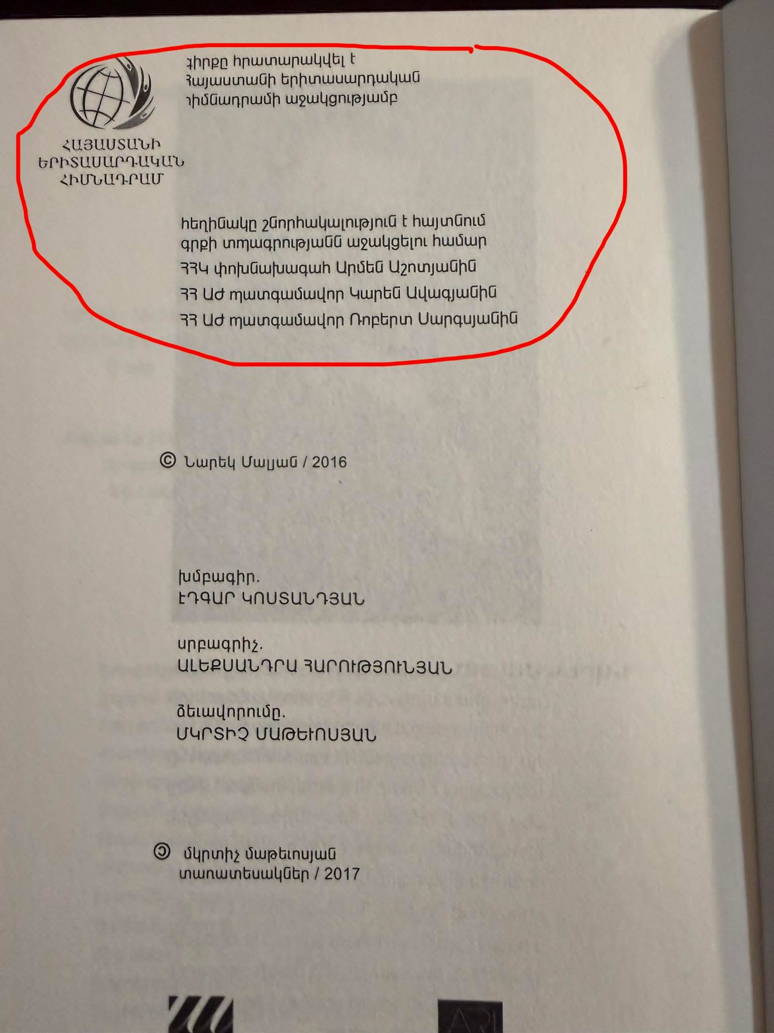 Ես չգիտեմ` Ալեն Սիմոնյանը ինչ հեքիաթ է հորինել իբր իմ «Զրոյական կետ» վեպի հրատարակմանն աջակցության մասին, բայց եթե իմ նվիրած գիրքը գոնե մեկ անգամ բացեր, այնտեղ կտեսներ գրքի հրատարակմանն աջակցած անձանց իմ գրավոր շնորհակալությունը: Այս մասին ֆեյսբուքյան իր էջում գրել է Նարեկ Մալյանը: