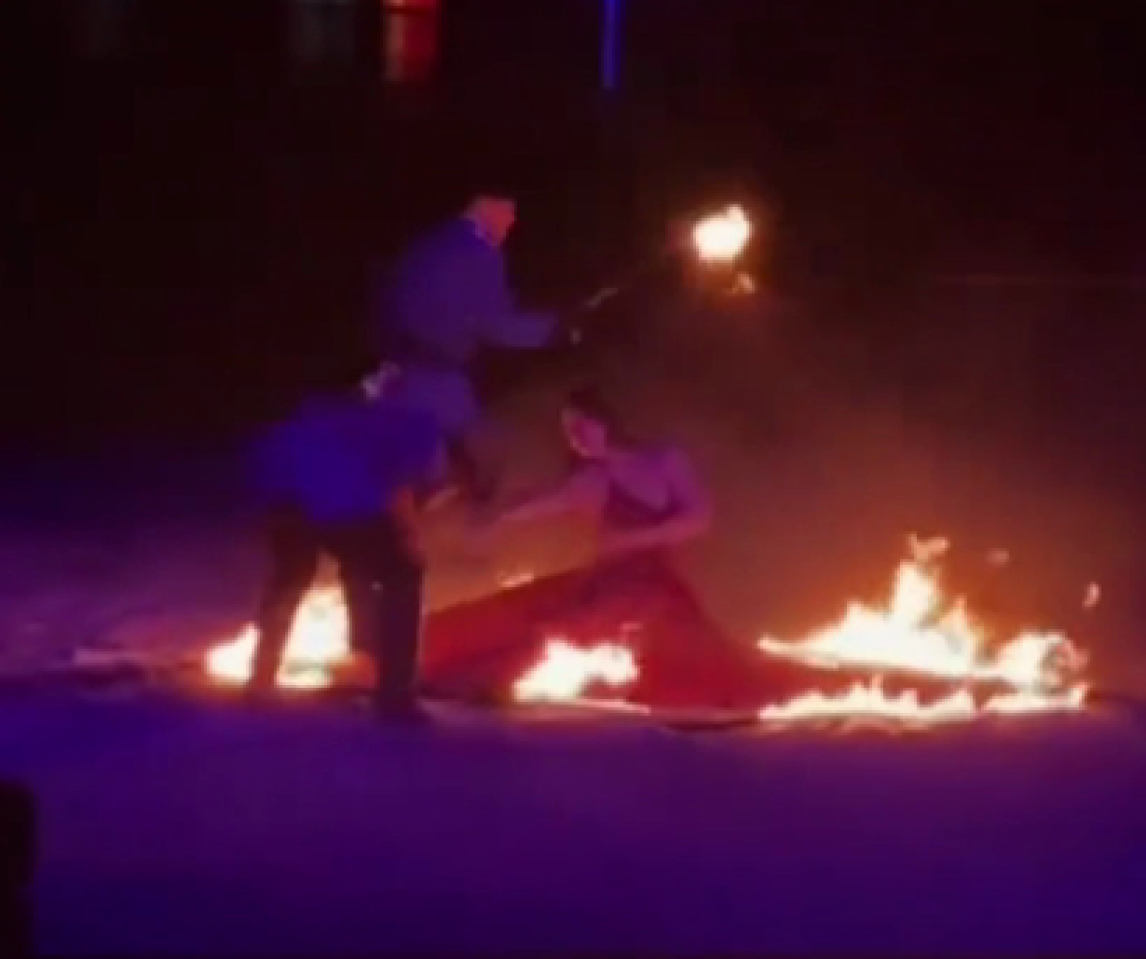 Դեպքը տեսագրվել է ծովի ափին կազմակերպված շոուի ժամանակ։ Կինը ելույթ է ունեցել ավազոտ տարածքում՝ կրակով օղակի ներսում։ Հանկարծ կայծեր են թռել նրա հագուստի վրա։ Ապա կրակը սկսել է կլանել կնոջ մազերն ու մարմինը։ Կինը խուճապահար իրեն նետել է գետը։ Նրան հաջողվել է մարել կրակը։