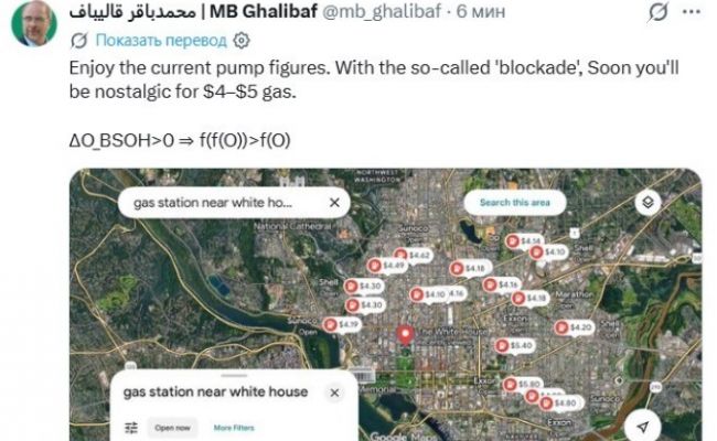 Ну, а спикер иранского Мажлеса Галибаф даже где-то поиздевался над Трампом и США. Американцы скоро с ностальгией будут вспоминать бензин по 4-5 долларов. Об этом он заявил в соцсети Х. Так Галибаф прокомментировал цены на городских АЗС в Вашингтоне на фоне заявления Трампа о начале блокады Ормузского пролива. «Ознакомьтесь с ценами на заправках. В связи с так называемой блокадой скоро вы будете с ностальгией вспоминать бензин по цене 4-5 долларов», – пишет Галибаф.