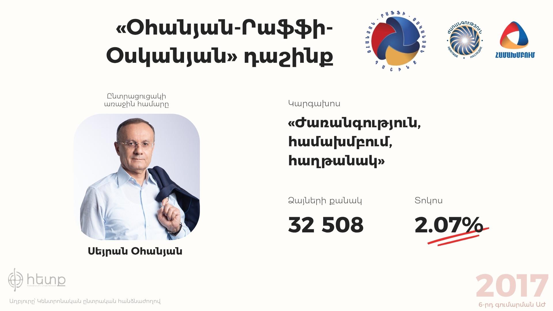 2017 թվականի խորհրդարանական ընտրություններին «Օհանյան-Րաֆֆի-Օսկանյան» դաշինքը ներկայացավ «Ժառանգություն, Համախմբում, Հաղթանակ» կարգախոսով։ Դաշինքի նախընտրական ցուցակը գլխավորում էր Սեյրան Օհանյանը, իսկ քարոզարշավի ընթացքում շեշտադրվում էին անվտանգության համակարգի ամրապնդման, կառավարման համակարգում արդյունավետության բարձրացման և երկրում համակարգային փոփոխություններ իրականացնելու թեզերը։ Չնայած լայնածավալ քարոզարշավին և առաջնորդների ճանաչելիությանը, ընտրությունների արդյունքում դաշինքը ստացավ ընտրողների ձայների ընդամենը 2,07 տոկոսը (32.508 քվե) և չկարողացավ հաղթահարել դաշինքների համար սահմանված 7 տոկոսի շեմը, ինչի հետևանքով դուրս մնաց վեցերորդ գումարման Ազգային ժողովից։