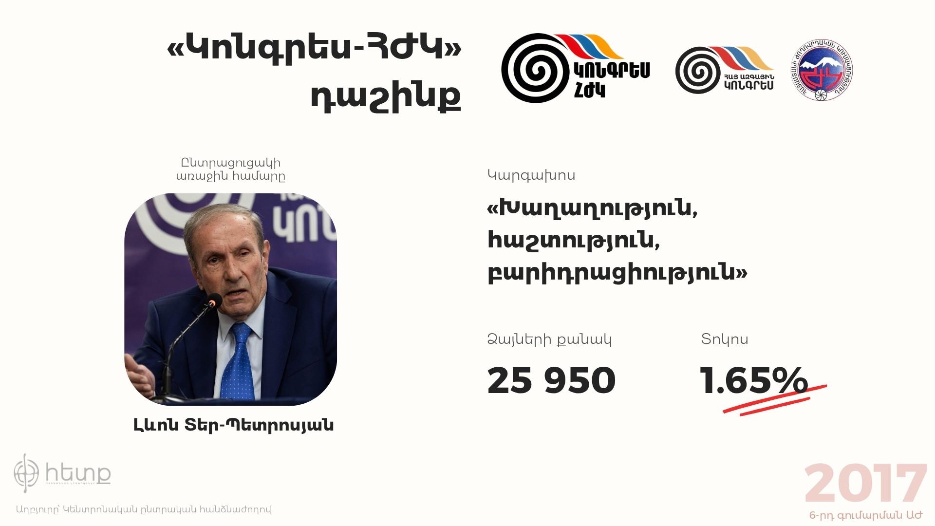 2017 թվականի խորհրդարանական ընտրություններին «Կոնգրես-ՀԺԿ» դաշինքը ներկայացավ «Խաղաղություն, հաշտություն, բարիդրացիություն» կարգախոսով։ Դաշինքի նախընտրական ծրագրի հիմնական շեշտադրումն ուղղված էր Արցախյան հարցի անհապաղ կարգավորմանը, որը դիտարկվում էր որպես Հայաստանի տնտեսական զարգացման և անվտանգության ապահովման նախապայման։ Քարոզարշավի ընթացքում դաշինքի առաջնորդները հորդորում էին ընտրողներին կողմ քվեարկել խաղաղության ծրագրին։ Ընտրությունների արդյունքում դաշինքը ստացավ 25.950 ձայն՝ 1,65 տոկոսը, և չկարողացավ հաղթահարել խորհրդարան անցնելու՝ դաշինքների համար սահմանված 7 տոկոսի շեմը։