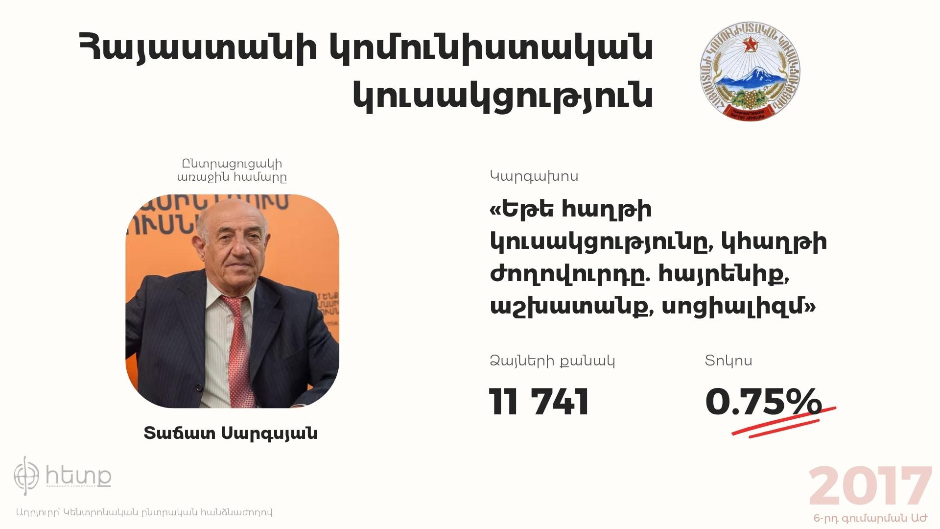 2017 թվականի խորհրդարանական ընտրություններին Հայաստանի կոմունիստական կուսակցությունը մասնակցեց «Եթե հաղթի կուսակցությունը, կհաղթի ժողովուրդը. հայրենիք, աշխատանք, սոցիալիզմ» կարգախոսով։ Նախընտրական ցուցակը գլխավորում էր կուսակցության կենտկոմի այն ժամանակվա առաջին քարտուղար Տաճատ Սարգսյանը։ Քարոզարշավի ընթացքում ուժը շեշտադրում էր անվճար կրթության և առողջապահության վերականգնումը, արդյունաբերության զարգացումը և Հայաստանի անվտանգության ապահովումը Ռուսաստանի հետ դաշնակցային հարաբերությունների միջոցով։ Այդ ընտրություններում կուսակցությունը ստացավ ձայների 0,75 տոկոսը ( 11.741 քվե) և չանցավ խորհրդարան։