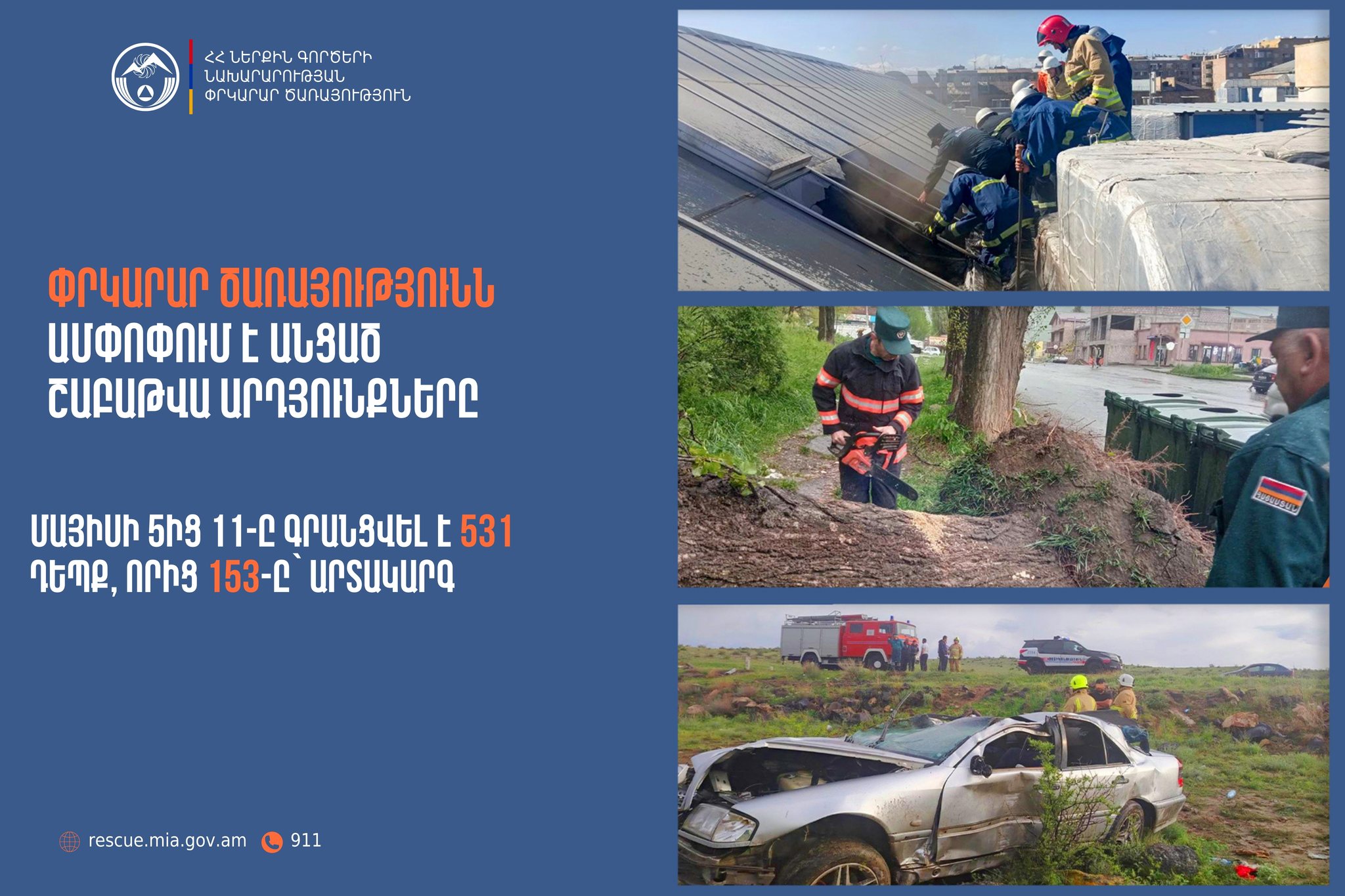 Մայիսի 5-ից 11-ը ՆԳՆ ՓԾ ճգնաժամային կառավարման ազգային կենտրոնում գրանցվել է 531 դեպք, որից 153-ը՝ արտակարգ: Այս մասին տեղեկացնում է ՆԳՆ Փրկարար ծառայությունը: