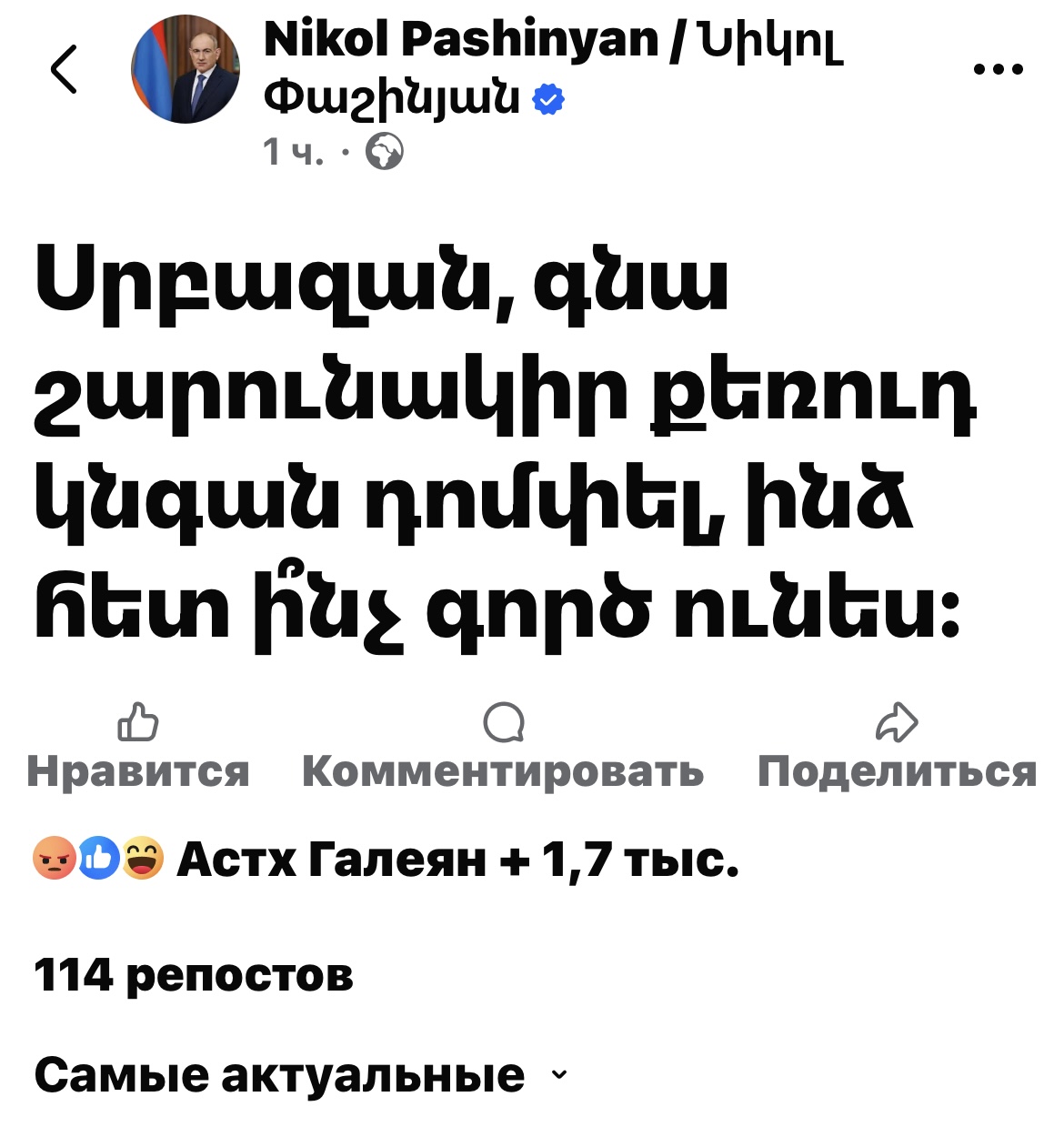ՖՈՏՈ. «Սրբազան, գնա շարունակիր քեռուդ կնգան դոմփել, ինձ հետ ի՞նչ գործ ունես». Փաշինյանի ոչ ադեկվատ գրառումը May 30, 2025 by Media ՖՈՏՈ. «Սրբազան, գնա շարունակիր քեռուդ կնգան դոմփել, ինձ հետ ի՞նչ գործ ունես». Փաշինյանի ոչ ադեկվատ գրառումը Friday, May 30, 2025 Views: * Քիչ առաջ նման գրառում է արել ՀՀ վարչապետ Նիկոլ Փաշինյանը. հանտնել