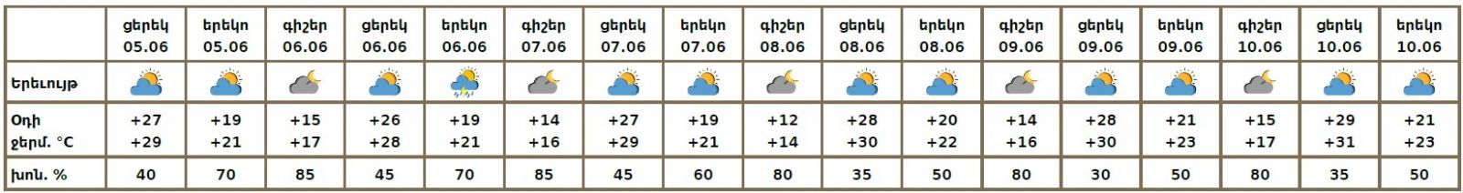Քամին՝ հյուսիսարևմտյան՝ 2-5 մ/վ, ամպրոպի ժամանակ սպասվում է քամու ուժգնացում՝ 18-22 մ/վ արագությամբ։ Օդի ջերմաստիճանը հունիսի 6-10-ին աստիճանաբար կբարձրանա 4-6 աստիճանով։