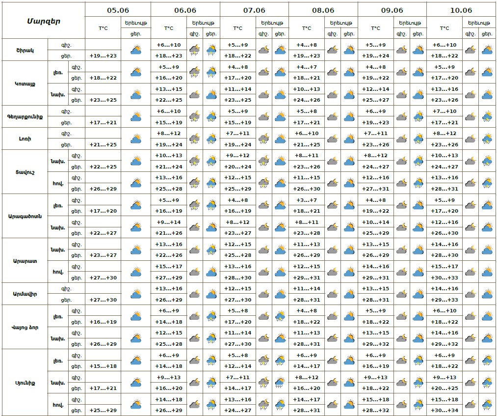 Հանրապետության տարածքում հունիսի 8-ին, 9-10-ի գիշերը սպասվում է առանց տեղումների եղանակ։ Հունիսի 6-7-ին գիշերը և կեսօրից հետո, 9-10-ին կեսօրից հետո առանձին շրջաններում սպասվում է կարճատև անձրև և ամպրոպ, հնարավոր է նաև կարկուտ։