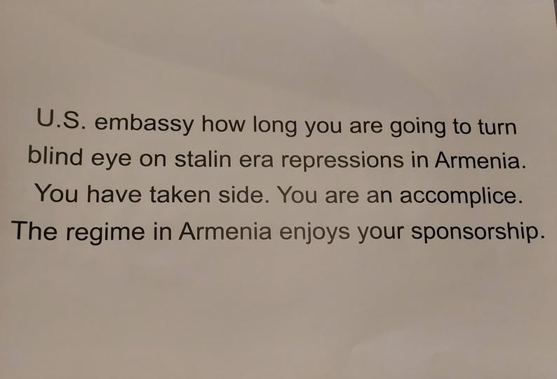 Պաստառի վրա գրված ա «ԱՄՆ դեսպանատուն որքա՞ն ես աչք փակելու Հայաստանում ստալինյան դարաշրջանի բռնաճնշումներին։ Դու կողմ ես վերցրել/բռնել։ Դու համահանցակից ես։ Հայաստանում գործող ռեժիմը վայելում է ձեր հովանավորությունը»»,-գրել է նա։