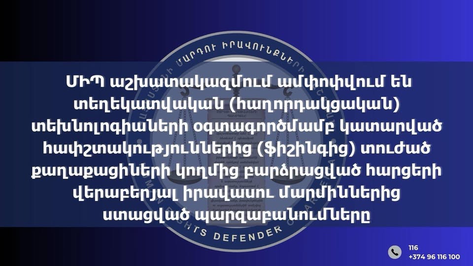 Պաշտպանի աշխատակազմում ամփոփվում են տեղեկատվական (հաղորդակցական) տեխնոլոգիաների օգտագործմամբ կատարված հափշտակություններից (ֆիշինգից) տուժած քաղաքացիների կողմից բարձրացված հարցերի վերաբերյալ իրավասու մարմիններից ստացված պարզաբանումները: