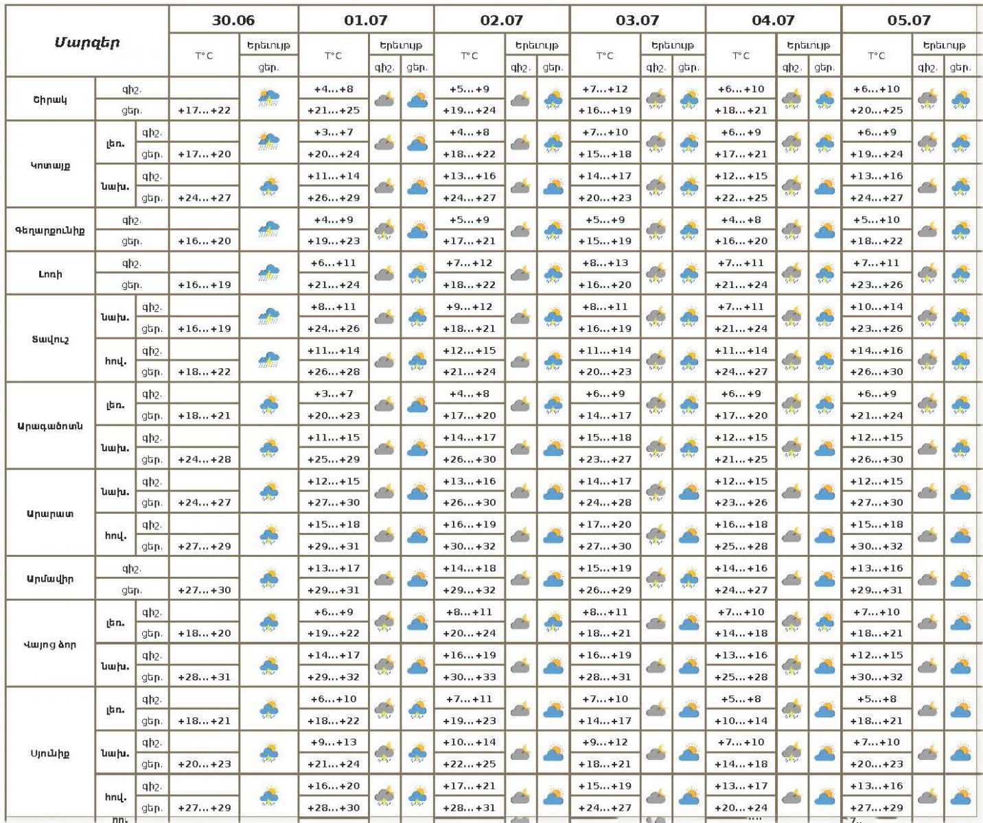 Հանրապետության տարածքում` հունիսի 30-ի ցերեկը շրջանների զգալի մասում սպասվում է անձրև և ամպրոպ, առանձին վայրերում՝ հորդառատ։ Հուլիսի 1-ին, 3-5-ին գիշերը և կեսօրից հետո, հուլիսի 2-ին կեսօրից հետո առանձին շրջաններում սպասվում է կարճատև անձրև և ամպրոպ, հնարավոր է նաև կարկուտ։
