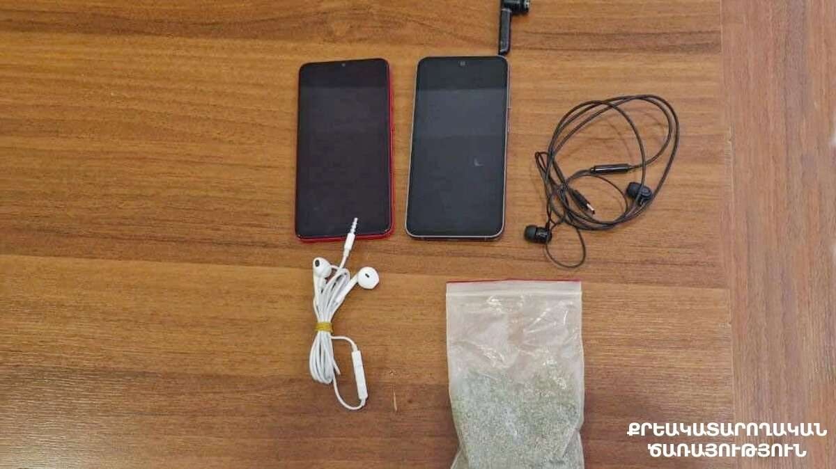 Խուզարկությամբ վերջիններիս անձնական իրերի միջից հայտնաբերվել են թմրամիջոցի նմանվող, 18,31 գրամ քաշով, դեղնականաչավուն, բուսական զանգված, 2 բջջային հեռախոս և 3 ականջակալ։