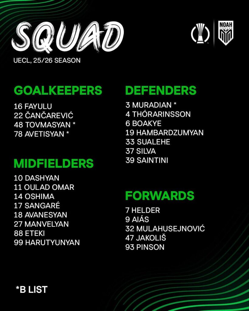 Հայաստանի գործող չեմպիոնը ներկայացրել է թիմի ամբողջական հայտացուցակը Կոնֆերենցիաների լիգայի խաղարկության լիգայի փուլի հանդիպումների համար։