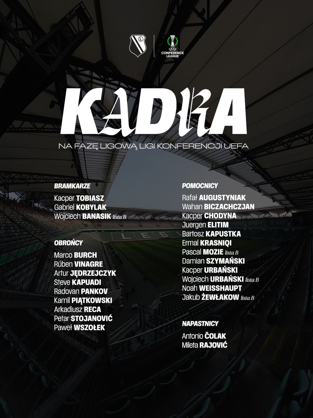 Վարշավայի «Լեգիան» հրապարակել է թիմի հայտացուցակը Կոնֆերենցիաների լիգայի 2025/26 մրցաշրջանի խաղարկության լիգայի փուլի հանդիպումների համար։
