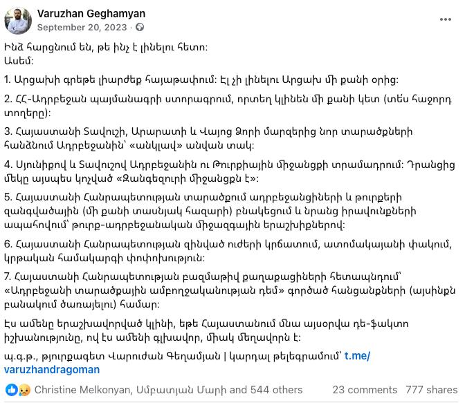 «Կից նկարի տեքստը ես գրել եմ 2023 թ. սեպտեմբերի 20-ին։ Չկա կետ, որն արդեն չի եղել կամ ընթացքի մեջ չէ։