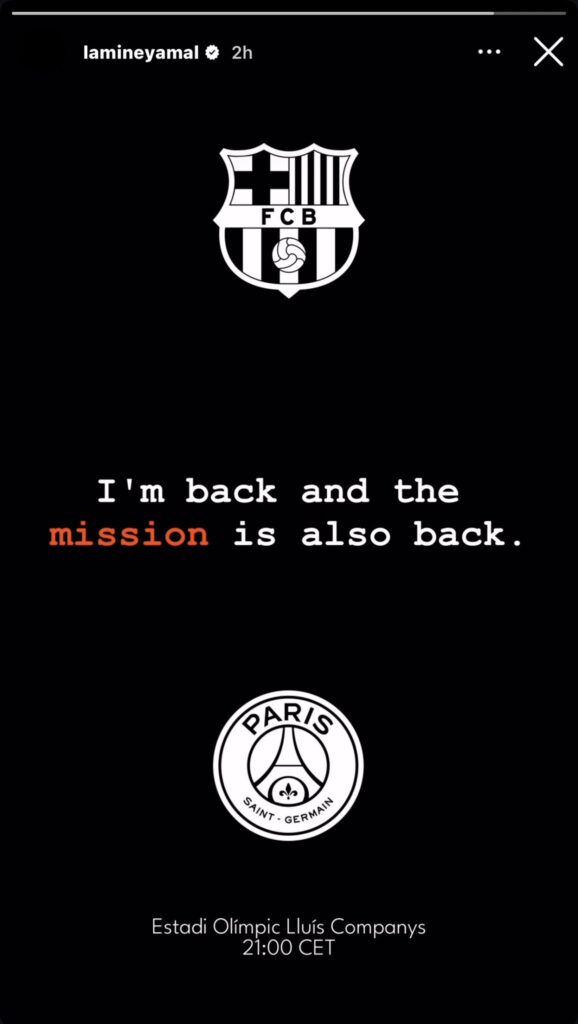 «Բարսելոնայի» իսպանացի հարձակվող Լամին Յամալը Instagram-ի Stories բաժնում գրառում է կատարել Չեմպիոնների լիգայի խաղարկության լիգայի փուլի երկրորդ տուրի՝ ՊՍԺ-ի դեմ խաղից առաջ։