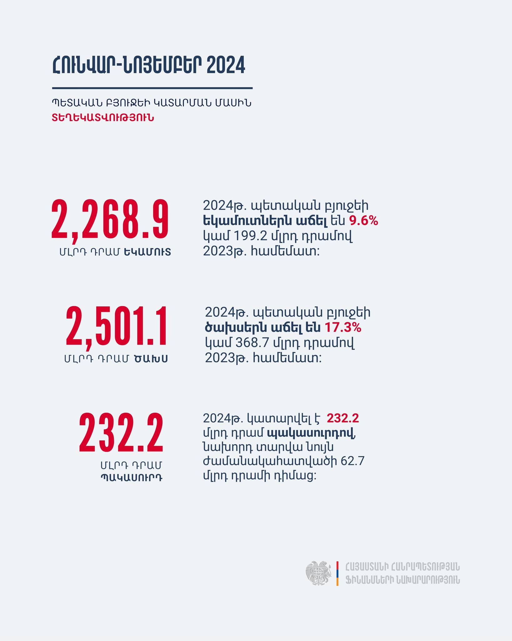 Հրապարակվել է ՀՀ 2024 թվականի հունվար-նոյեմբեր ամիսների պետական բյուջեի կատարման մասին տեղեկատվությունը: