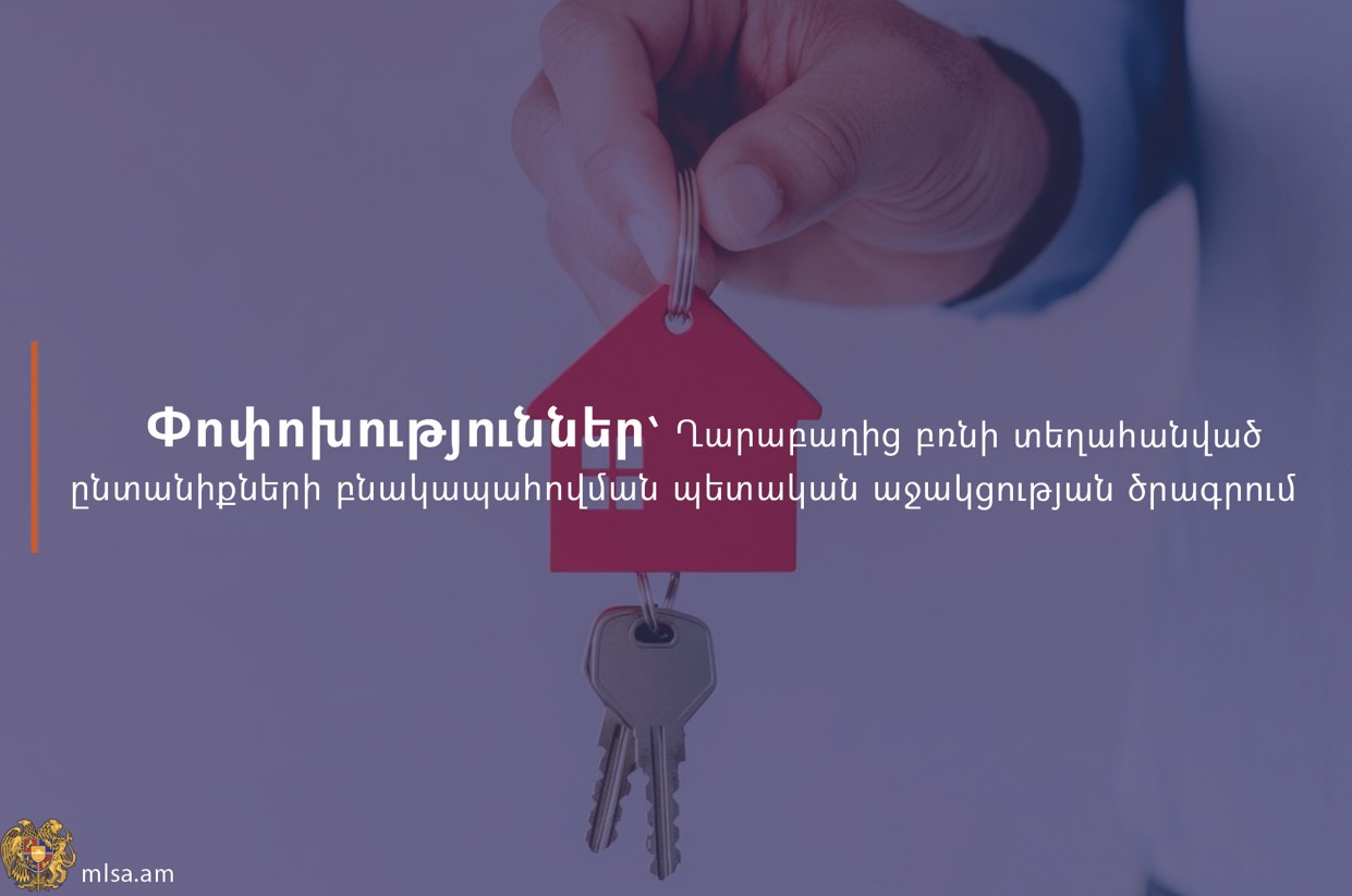 Իրականացվում են փոփոխություններ Ղարաբաղից բռնի տեղահանված ընտանիքների բնակարանային ապահովման պետական աջակցության ծրագրում․ Կառավարությունն այսօրվա նիստում հաստատել է Աշխատանքի և սոցիալական հարցերի նախարարության մշակած նախագիծը։