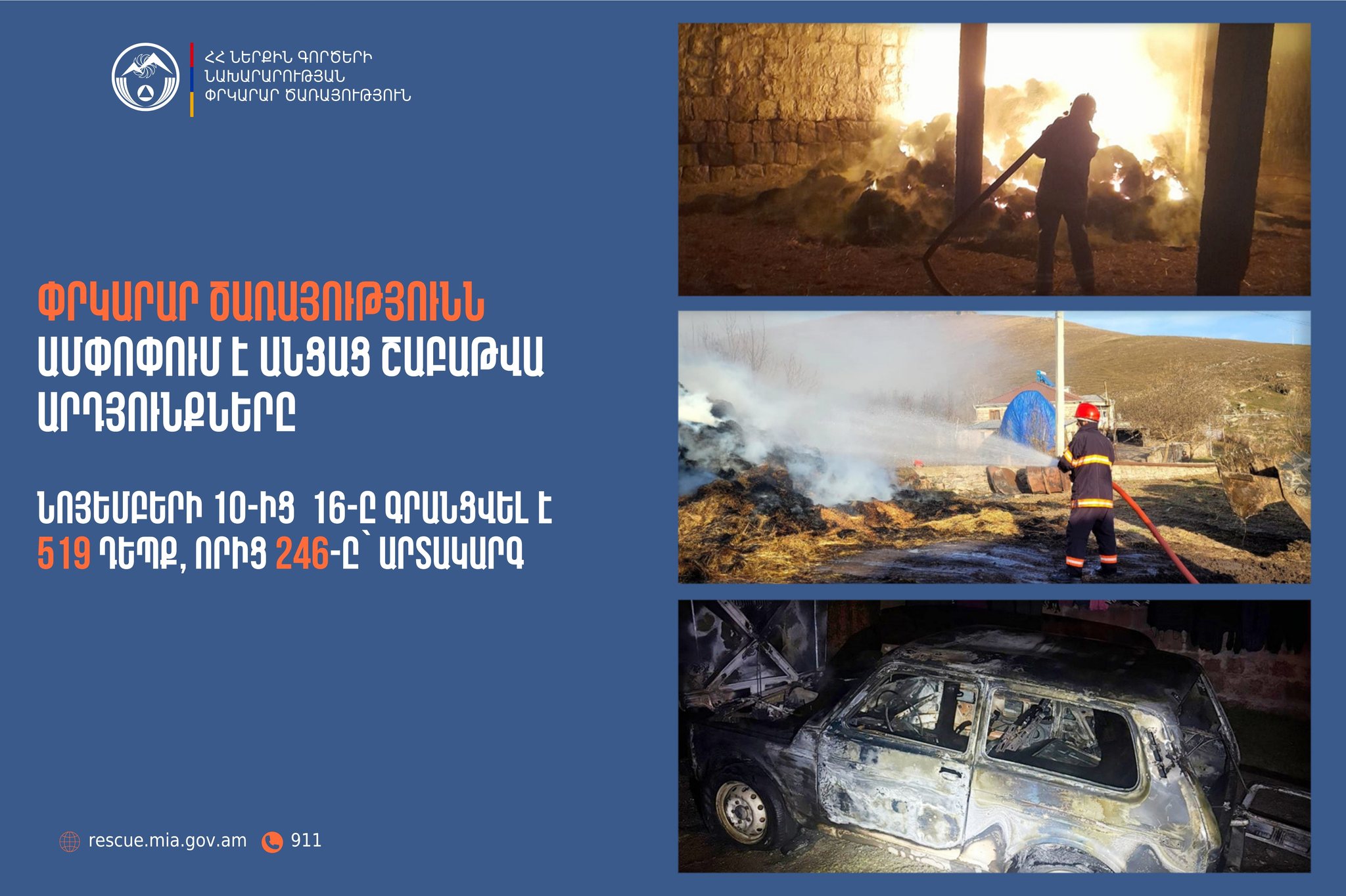 Նոյեմբերի 10-16-ը ՆԳՆ ՓԾ ճգնաժամային կառավարման ազգային կենտրոնում գրանցվել է 519 դեպք, որից 246-ը՝ արտակարգ: Այս մասին տեղեկացնում են ՆԳՆ փրկարար ծառայությունից: