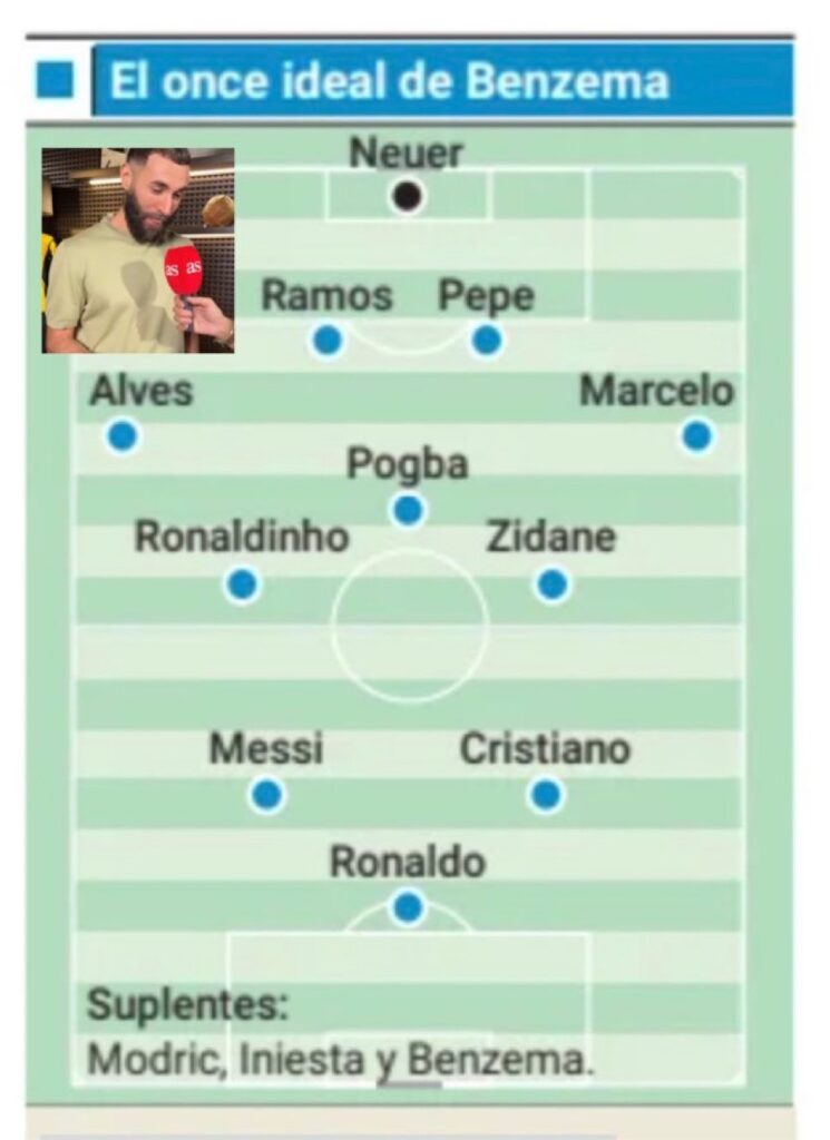 «Ալ-Իթիհադի» 37-ամյա ֆրանսիացի հարձակվող Կարիմ Բենզեման կազմել է իր երազանքի թիմը։ Խաղացողը ընտրել է 4-3-3 խաղային դասավորությունը, հայտնում է AS-ը։